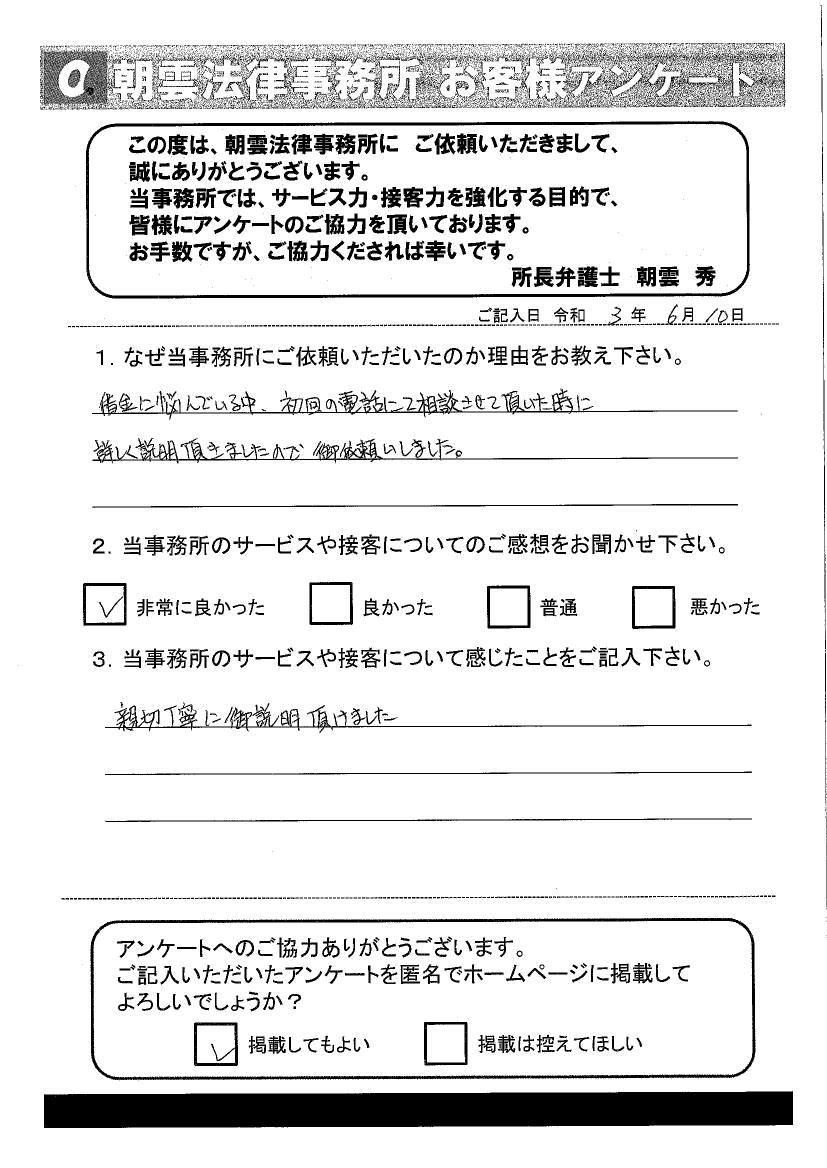 借金に悩んでいる中、初回の電話にて相談させて頂いた時に詳しく説明頂きましたので御依頼しました。